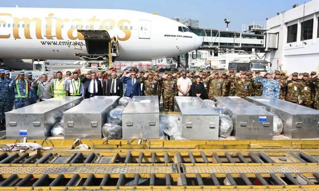 গতকাল শনিবার বেলা ১১টা ৫ মিনিটে এমিরেটস এয়ারলাইন্সের মরদেহবাহী ফ্লাইটটি হযরত শাহজালাল আন্তর্জাতিক বিমানবন্দরে অবতরণ করে। সেনাবাহিনীর চিফ অব জেনারেল স্টাফ লেফটেন্যান্ট জেনারেল মিজানুর রহমান শামীম বিমানবন্দরে শান্তিরক্ষীদের মরদেহ গ্রহণ করেন। এসময় বেসামরিক বিমান চলাচল কর্তৃপক্ষের চেয়ারম্যান; বাংলাদেশে জাতিসংঘের ভারপ্রাপ্ত আবাসিক প্রতিনিধি; আবেইতে মোতায়েনরত জাতিসংঘ মিশন ইউনিসেফের ফোর্স কমান্ডারের প্রতিনিধি, চিফ কমিউনিটি লিয়াজো অফিসার; পররাষ্ট্র মন্ত্রণালয়ের ডিজি (ইউএন); ওভারসিজ অপারেশন পরিদপ্তরের পরিচালক; ঊর্ধ্বতন সামরিক বেসামরিক কর্মকর্তা এবং গণমাধ্যমের ব্যক্তিরা উপস্থিত ছিলেন।