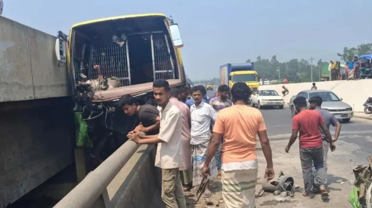 এতে চালক নিয়ন্ত্রণ হারিয়ে ফেললে বাসটি আইল্যান্ড ও ওভারব্রিজের মাঝখানে ধাক্কা লেগে আটকে যায়। এতে ঘটনাস্থলেই বাসের চালক ও হেলপার নিহত হন। পরে হাসপাতালে নেওয়ার পথে আরও একজনের মৃত্যু হয়।