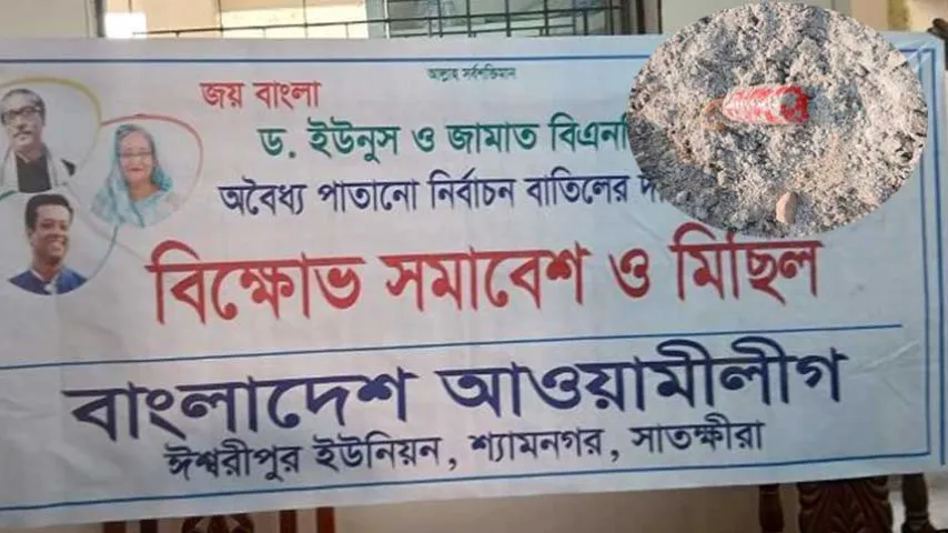 ব্যানারে লেখা ছিল, ‘ড. ইউনুস ও জামায়াত-বিএনপির অবৈধ পাতানো নির্বাচন বাতিলের দাবিতে বিক্ষোভ সমাবেশ ও মিছিল, বাংলাদেশ আওয়ামী লীগ, ঈশ্বরীপুর ইউনিয়ন, শ্যামনগর, সাতক্ষীরা।’ মঙ্গলবার (১৭ ফেব্রুয়ারি) শ্যামনগর থানার অফিসার ইনচার্জ (ওসি) খালেদুর রহমান ঘটনার সত্যতা নিশ্চিত করেছেন।