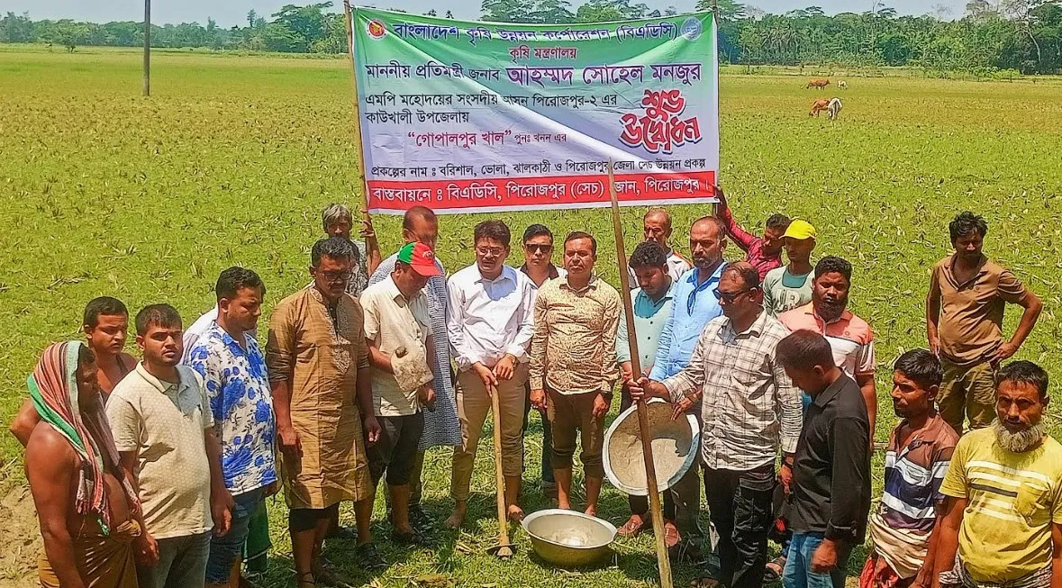 পিরোজপুরের কাউখালীতে কৃষিজমিতে সেচ সুবিধা বৃদ্ধি এবং জলাবদ্ধতা নিরসনের লক্ষ্যে বাংলাদেশ কৃষি উন্নয়ন কর্পোরেশন (বিএডিসি’র) বাস্তবায়নে খাল পুনঃখনন কাজের শুভ উদ্বোধন করা হয়েছে। মঙ্গলবার (৭ এপ্রিল) সকালে পিরোজপুর-২ আসনের মাননীয় সংসদ সদস্য ও গণপ্রজাতন্ত্রী বাংলাদেশ সরকারের গৃহায়ন ও গণপূর্ত প্রতিমন্ত্রী আহমেদ সোহেল মঞ্জুর প্রধান অতিথি হিসেবে ভিডিও কনফারেন্সের মাধ্যমে এই উন্নয়নমূলক কাজের উদ্বোধন করেন।