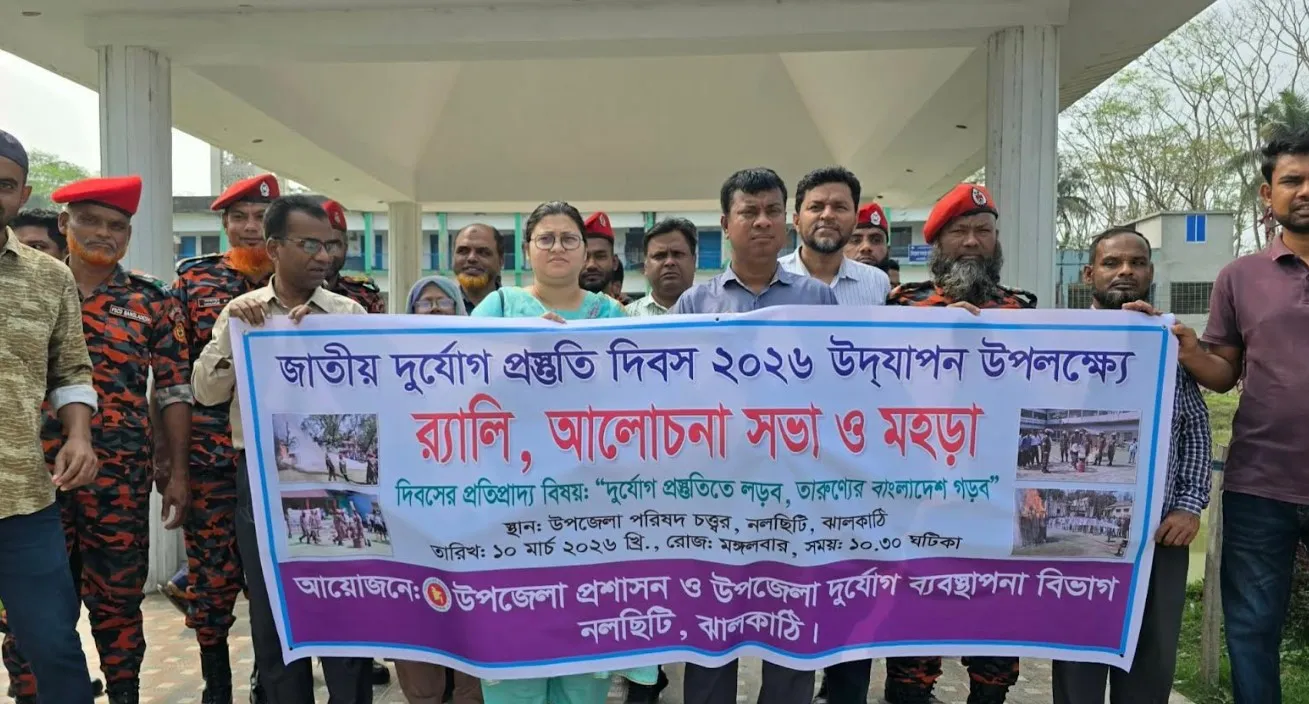ঝালকাঠির নলছিটিতে জাতীয় দুর্যোগ প্রস্তুতি দিবস ২০২৬ উপলক্ষে র্যালি, আলোচনা সভা ও মহড়ার আয়োজন করা হলেও তা ছিল অনেকটাই দায়সারা আয়োজন এমন অভিযোগ উঠেছে স্থানীয়দের মধ্যে।