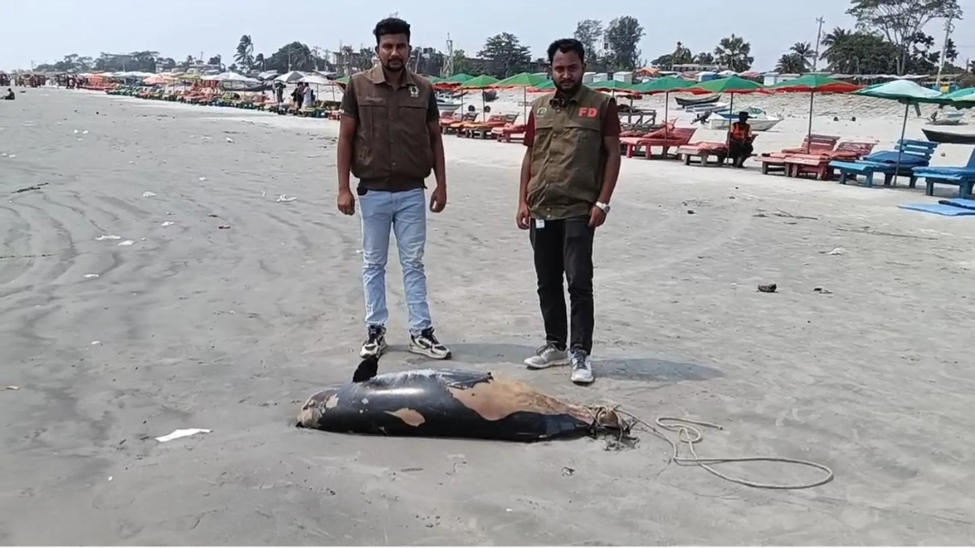 কুয়াকাটা সমুদ্র সৈকতে আবারও একটি ৮ ফুট লম্বা মৃত ডলফিন ভেসে এসেছে। সৈকতের পশ্চিম পাশে জোয়ারের পানির সাথে ভেসে আসা ডলফিনটির শরীরের বেশিরভাগ অংশের চামড়া উঠে গেছে এবং পেট ফেটে গেছে। দড়ি দিয়ে লেজ বাঁধা সহ শরীরের বিভিন্ন স্থানে আঘাতের চিহ্ন দেখা গেছে। স্থানীয় উপরা সদস্য আব্দুল জলিল প্রথম ডলফিনটি দেখতে পান এবং পরে বিষয়টি সংশ্লিষ্ট কর্তৃপক্ষকে জানান।