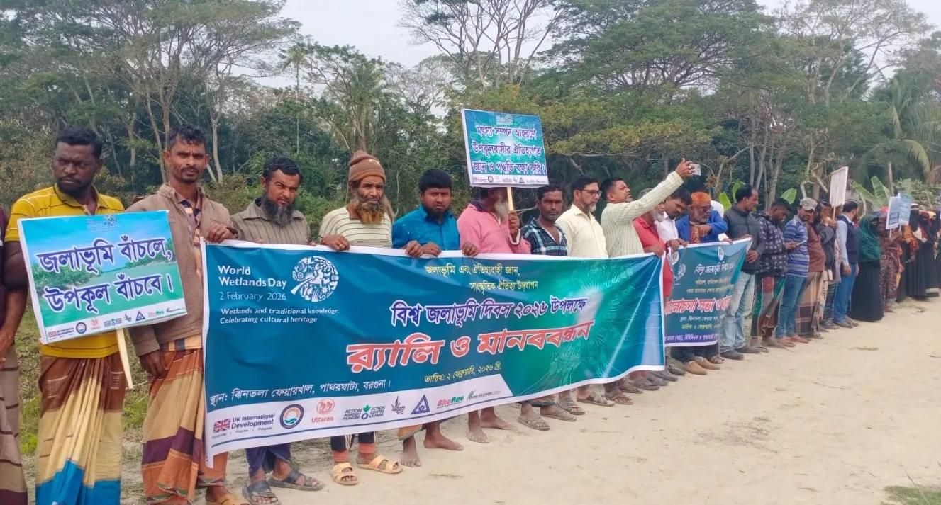বরগুনার পাথরঘাটায় জলাভূমি রক্ষার দাবিতে মানববন্ধন করা হয়। সোমবার (২ ফেব্রুয়ারি) বেলা ১০ টার দিকে 'জলাভূমি ও ঐতিহ্যবাহী জ্ঞান: সাংস্কৃতিক ঐতিহ্য উদযাপন'‘ প্রতিপাদ্য নিয়ে বিশ্ব জলাভূমি দিবস উপলক্ষে পাথরঘাটা উপজেলার সদর পাথরঘাটা ইউনিয়নের জীনতলা গ্রামের কয়েকশ বছরের পুরনো জলাশয়ে(ফেয়ার খাল) রক্ষার দাবিতে মানববন্ধনে করেছে এলাকার প্রায় চার শতাধিক মানুষ।